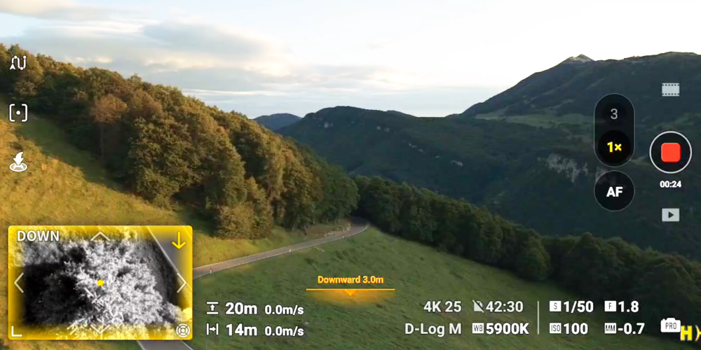 El asistente de visión del DJI Air 3S proporciona una vista hacia abajo además de las vistas frontal, posterior, izquierda y derecha para ayudarlo a comprender mejor su entorno.